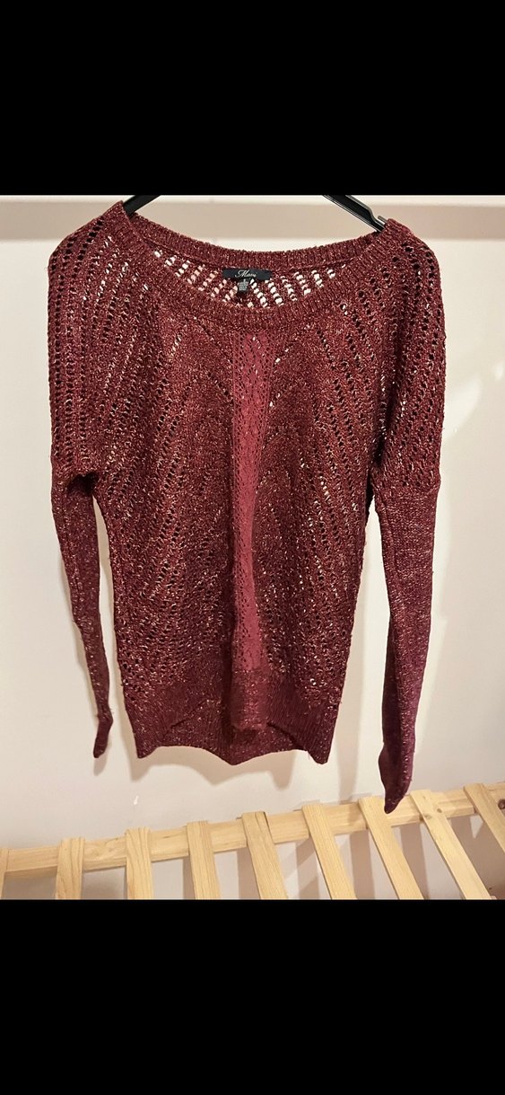 Bordo renkli, uzun kollu örgü kadın kazak. Bohem tarzda, vücuda oturan kesim, günlük kullanıma uygun.