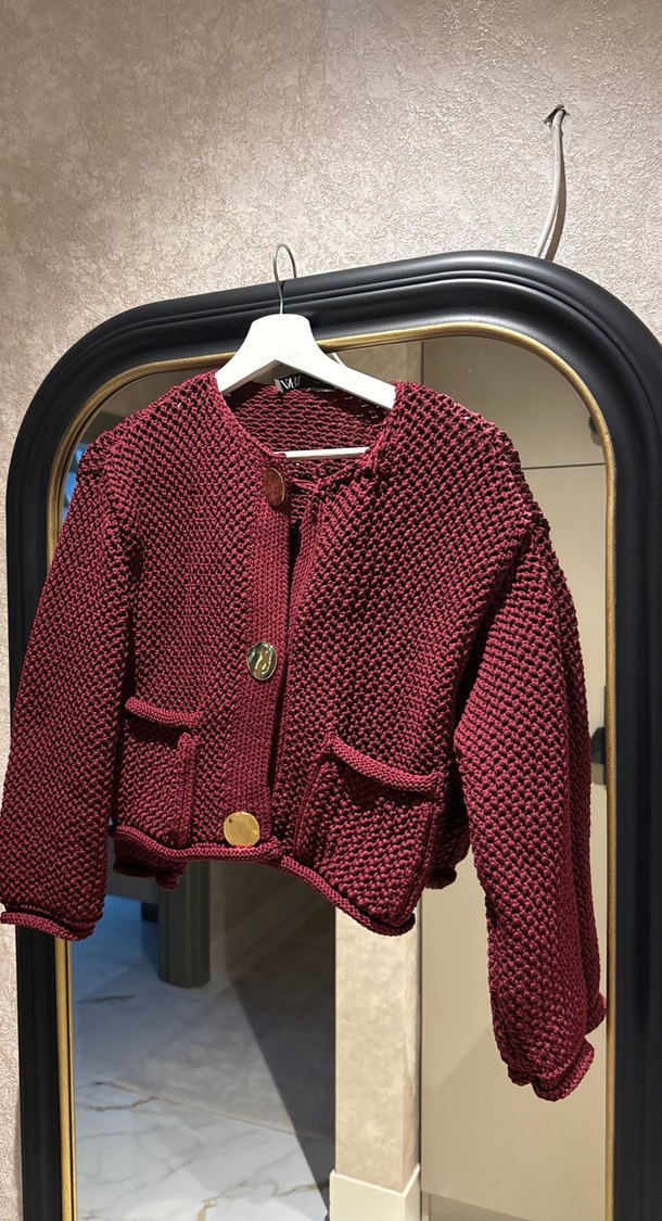 Bordo renkli, uzun kollu, kısa kesim, notched lapel yakalı, bol kesim örgü kadın hırkası. İki ön cepli, rahat ve şık sokak stili için uygundur.