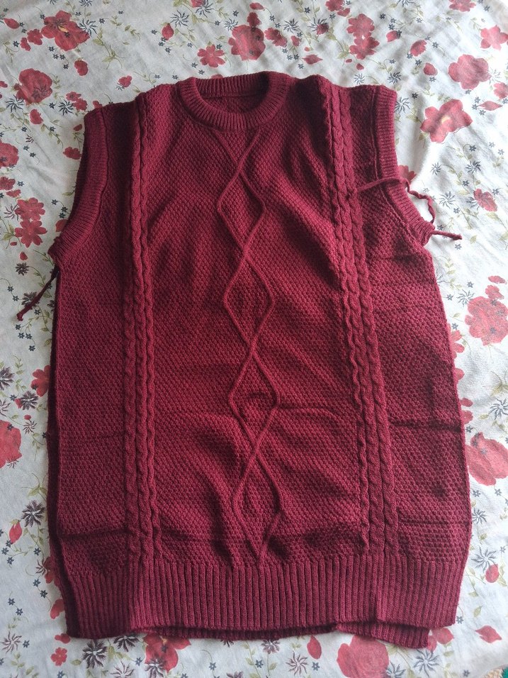 Bordo renkli, örgü dokulu, kolsuz kadın süveter. Yuvarlak yaka ve bol kesim ile rahat bir kullanım sağlar. Midi boyda, günlük kullanıma uygundur.