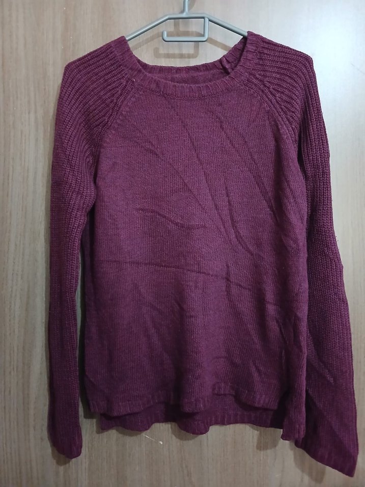 Bordo renkli, örgü kumaştan yapılmış, yuvarlak yakalı ve uzun kollu, rahat kesim ve normal boyda kadın triko kazak. Günlük kullanıma uygundur.