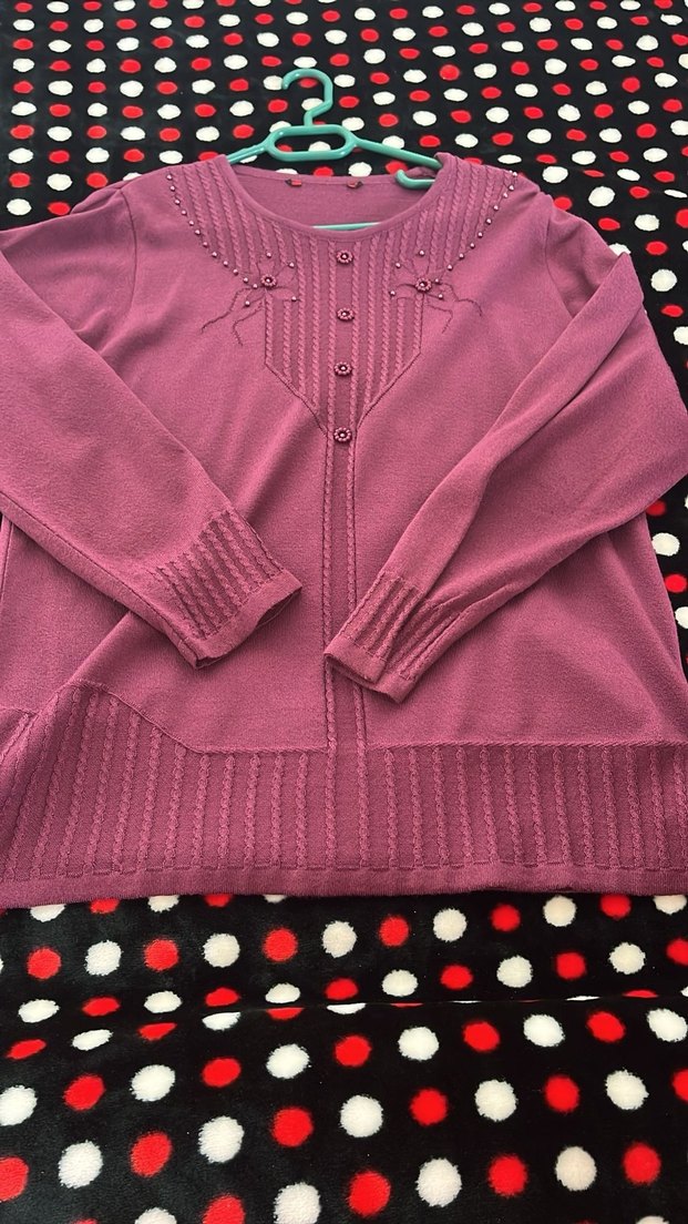 Bordo renkli, uzun kollu, yuvarlak yaka, bol kesim örgü kadın triko kazak. Ön kısmında işleme detayları bulunur, günlük kullanıma uygundur.