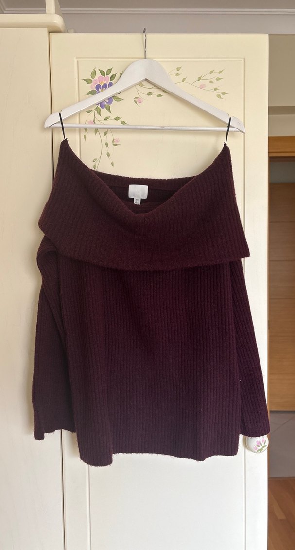 Bordo renkli, yün kumaştan, bol kesim, uzun kollu ve straplez sahip örgü kadın triko kazak. Rahat ve bohem tarzda, günlük kullanım için uygundur.