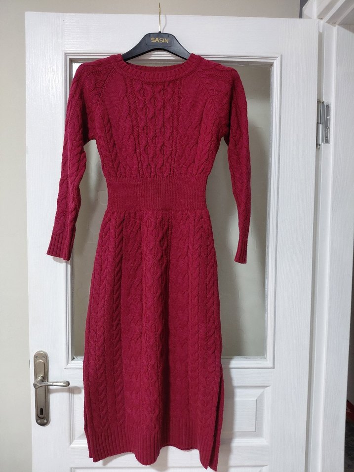 Bordo renkli, uzun kollu ve bisiklet yaka, vücuda oturan örgü kadın elbisesi. Rahat ve sıcak dokusu günlük kullanım için uygundur. Boy:115 göğüs 40 cm