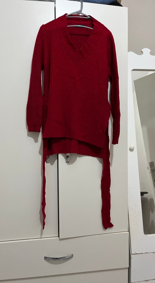 Bordo renkli, örgü kumaştan yapılmış, v yaka ve uzun kollu dar kesim bir kazak. Günlük kullanıma uygun, rahat ve trend sokak stili için ideal.
