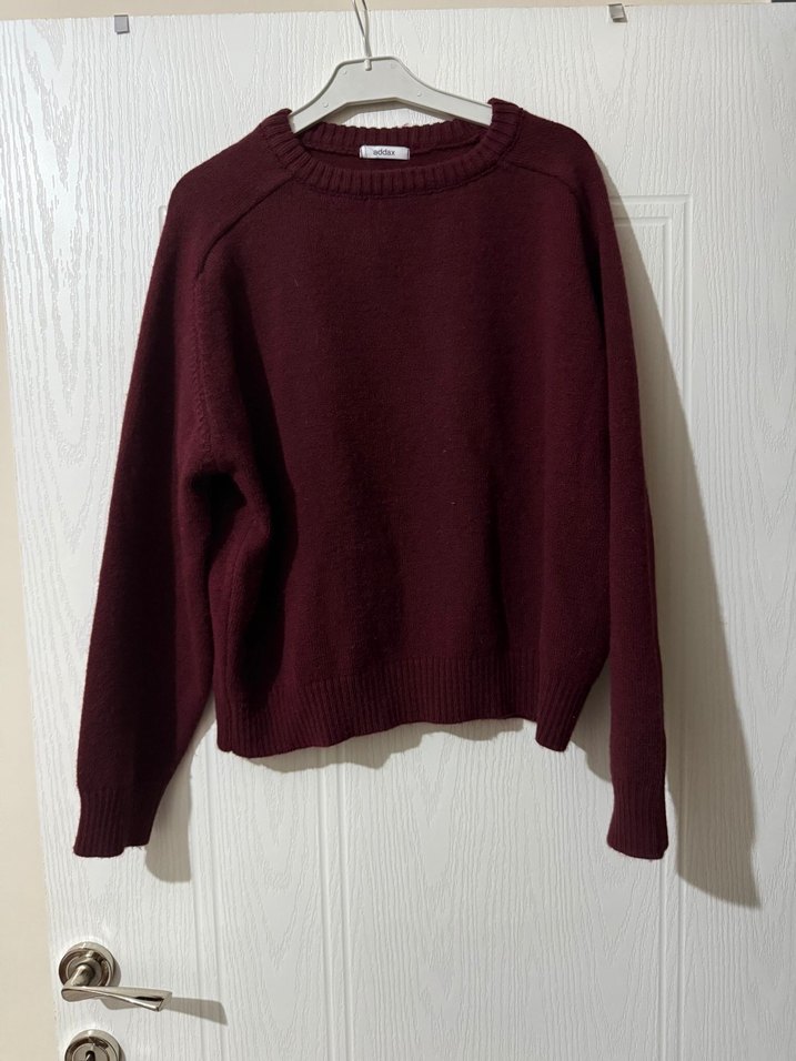 Bordo renkli, örgü yün kazak. Yuvarlak yaka ve uzun kollu, bol kesim ve midi boyda. Günlük kullanıma uygun sade ve rahat tarzda.