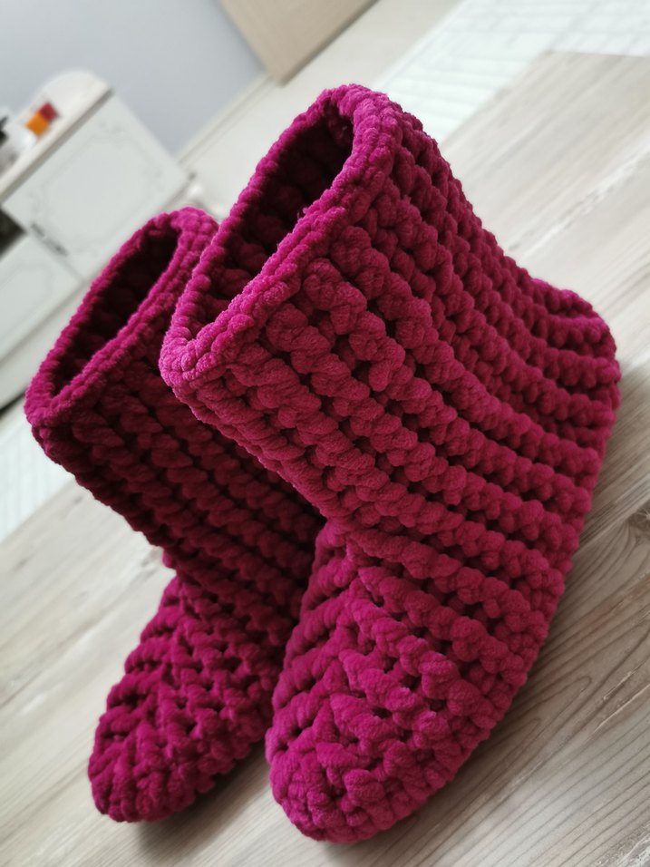 Bordo renkli, örgü kız çocuk ev botu, yumuşak ve sıcak dokusuyla sade bohem tarzında.