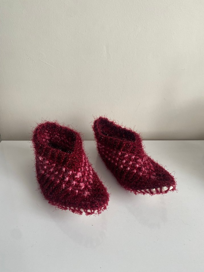 Bordo renkli, örgü yapıda kız çocuk ev terliği. Sıcak tutan dokusu ve renkli görünümü ile rahat kullanım sağlar.