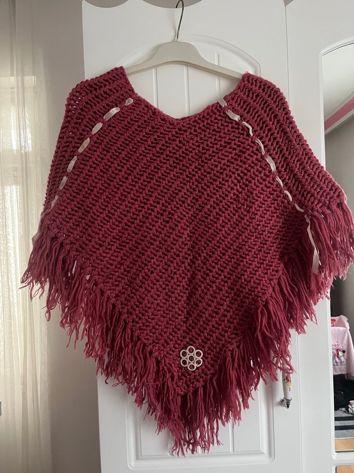 Bordo renkli, örgü kız pançosu, salaş kesim, bisiklet yaka . Kenarlarında püsküller ve önünde dekoratif detaylar bulunur. Bohem tarzda. Ürün tamamen el örgüsü