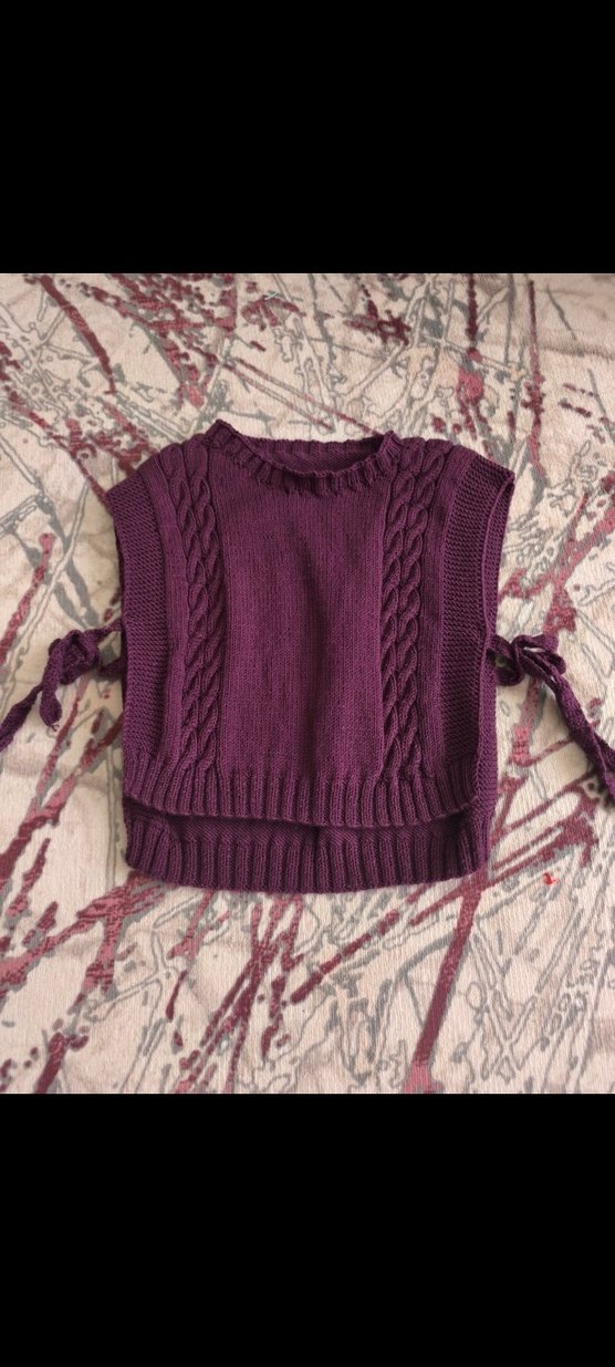 Bu koyu bordo renkli örgü kolsuz süveter, bol kesim, yuvarlak yaka ve kısa boyda olup yanlarda bağcık detayları taşır.