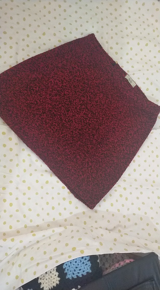 Bu bordo renkli, örgü dokulu ve sade tasarımlı dar kesim mini etek, dış mekan kullanımı için uygun, rahat ve normcore tarzda.