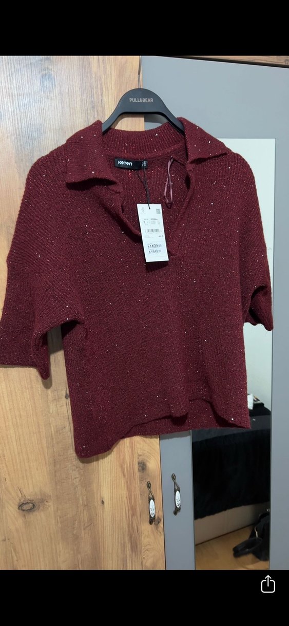Bordo renkli, kısa kollu, yün örgü kazak. Salaş kesim ve kısa boyuyla rahat, şık bir günlük sokak stili parçası. Desensiz ve yakalı tasarıma sahip.
