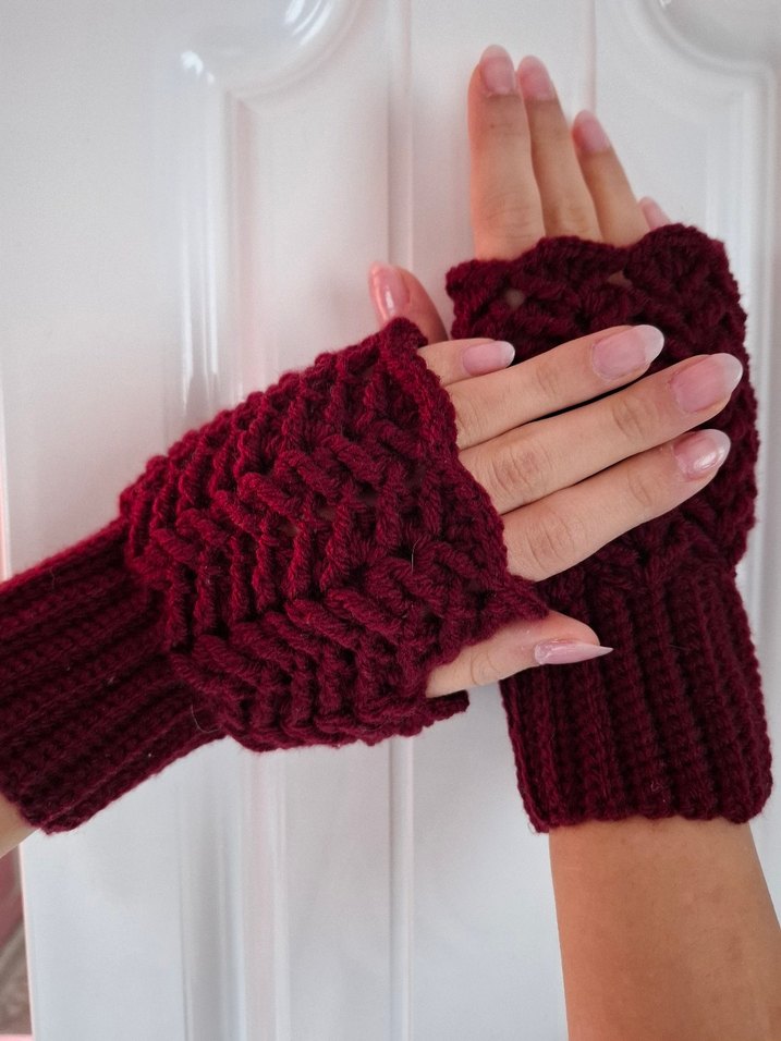 Bordo renkli, örgü parmakları açık kadın eldiveni, rahat ve bohem tarzda, renkli dokulu desene sahiptir. Parmak hareketine izin verir. El örgüsüdür.