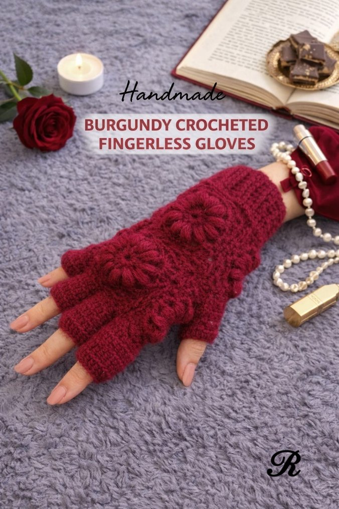 Bordo renkte, bohem tarzda, el işi örgü parmaksız kadın eldiveni. Rahat ve dekoratif tığ işi desenlere sahip.