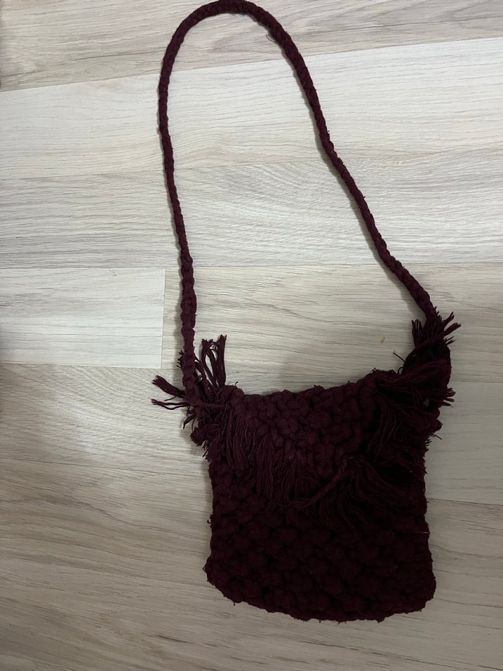 Bordo renkli, örgü kumaştan yapılmış, püskül detaylı ve örgülü askılı bohem tarzda kadın çantasıdır. Günlük kullanıma uygundur.