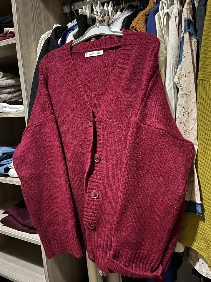 Bordo renkli, örgü kumaştan yapılmış, salaş kesim uzun kollu kadın hırka. Midi boyda ve rahat kullanıma uygun, sokak stiline uyumlu bir parça.