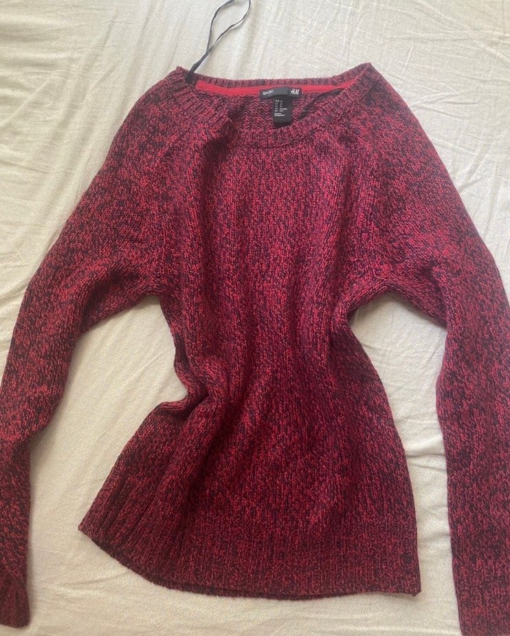 Bordo renkli, örgü kumaştan yapılmış, salaş kesim uzun kollu ve yuvarlak yakalı kadın kazak. Günlük sokak stili için uygun, desensiz ve normal boyda.