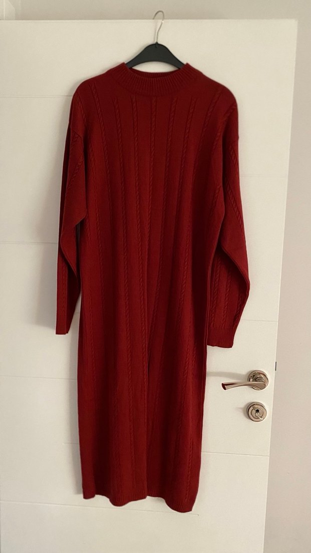 Bordo renkli, uzun örgü elbise, fitted kesim, uzun kollu ve yüksek yakalıdır. Rahat ve bohem tarzda, günlük kullanıma uygundur.