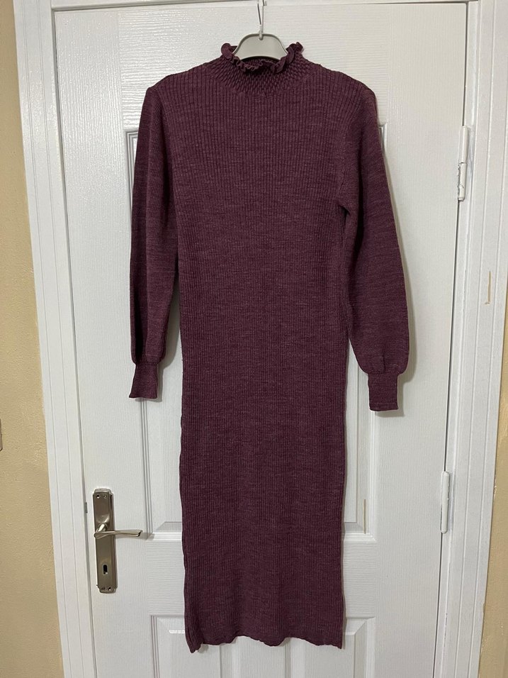 Bordo renk, yüksek yakalı ve uzun kollu örgü triko elbise, günlük kullanıma uygun rahat ve sade bir tarz sunar.