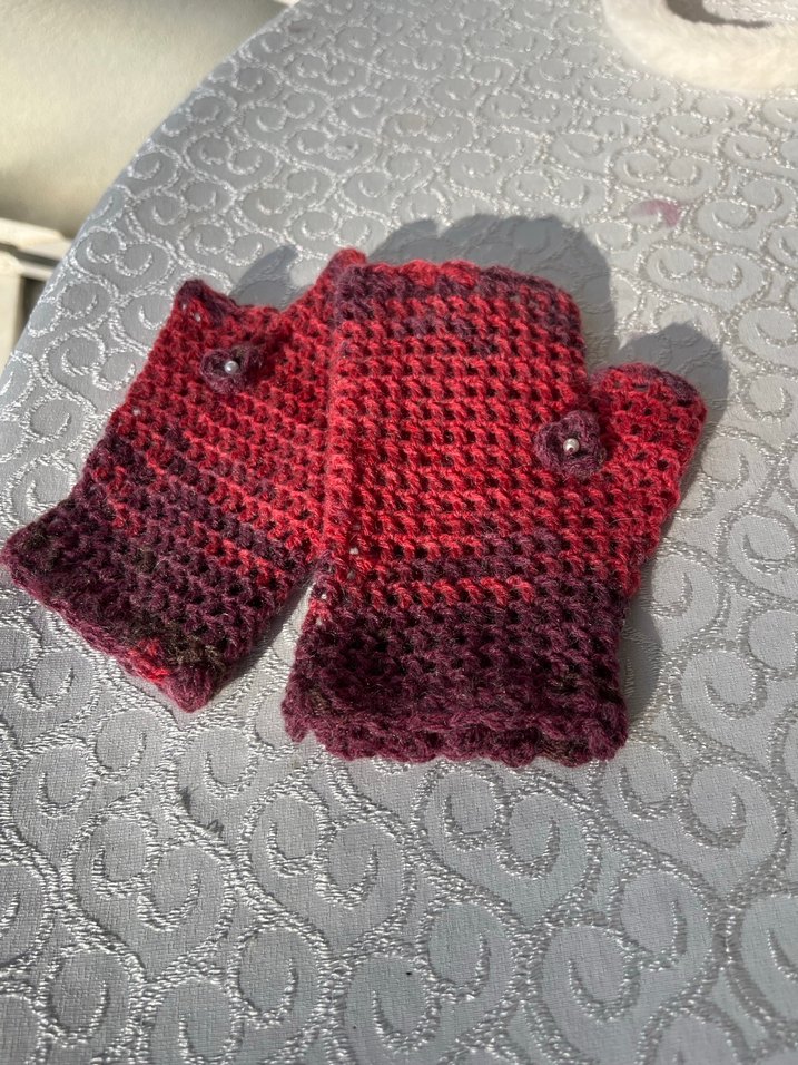 Bordo tonlarında, yarım parmaklı ve küçük düğmeli örgü kadın eldivenleri. Sıcak ve bohem tarzda, rahat bir kullanım sunar.