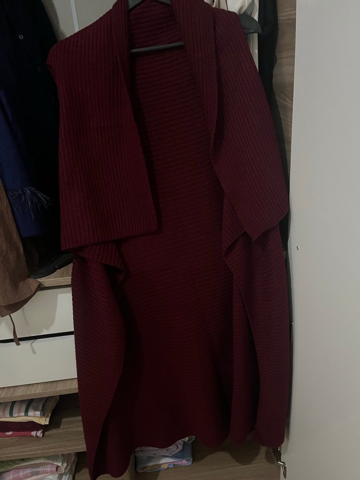 Bordo renkli, örgü yün yelek. Salaş kesimiyle midi boyda, desensiz ve rahat normcore tarzındadır.