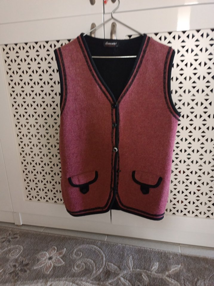 Bordo renkli, V yaka ve örgü yün kumaştan yapılmış kolsuz yelek. Siyah şerit detaylı, iki ön cepli, rahat kesim günlük sokak stili için uygun.