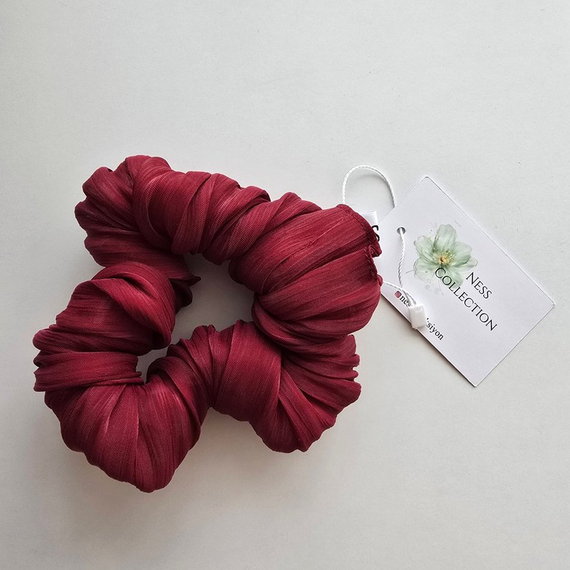 Bordo renkli, lastikli ve saten kumaştan yapılmış, renkli ve minimalist bohem tarzda bir saç aksesuarı.