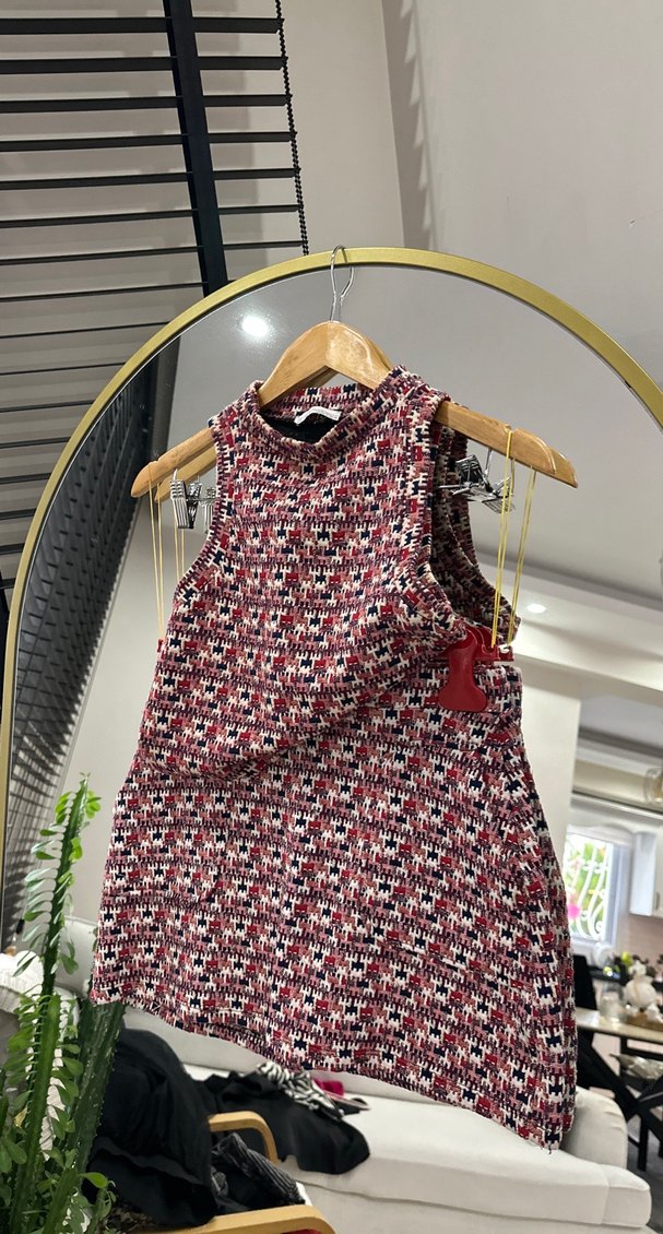 Bordo renkli, örme kumaştan kolsuz, yüksek yakalı ve bol kesim mini hamile bluzu. Renkli batik desenli, günlük kullanıma uygun sokak modası tarzında.
