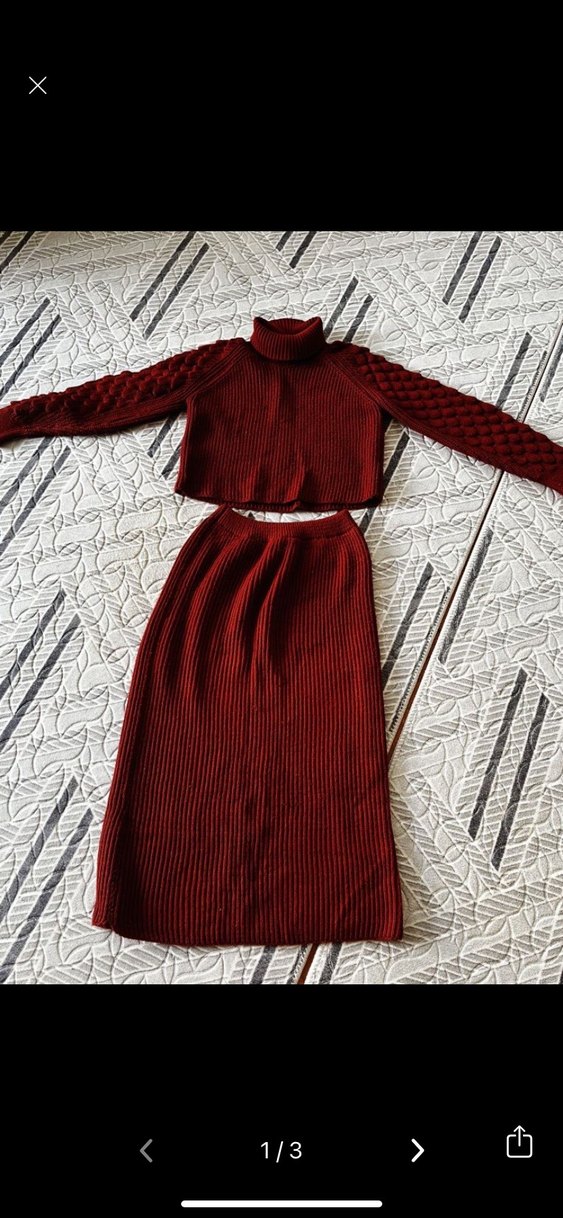 Bordo renkli, uzun kollu boğazlı ve fitted kesim örme triko kazak ile uzun ribanalı etekten oluşan rahat ve şık takım.