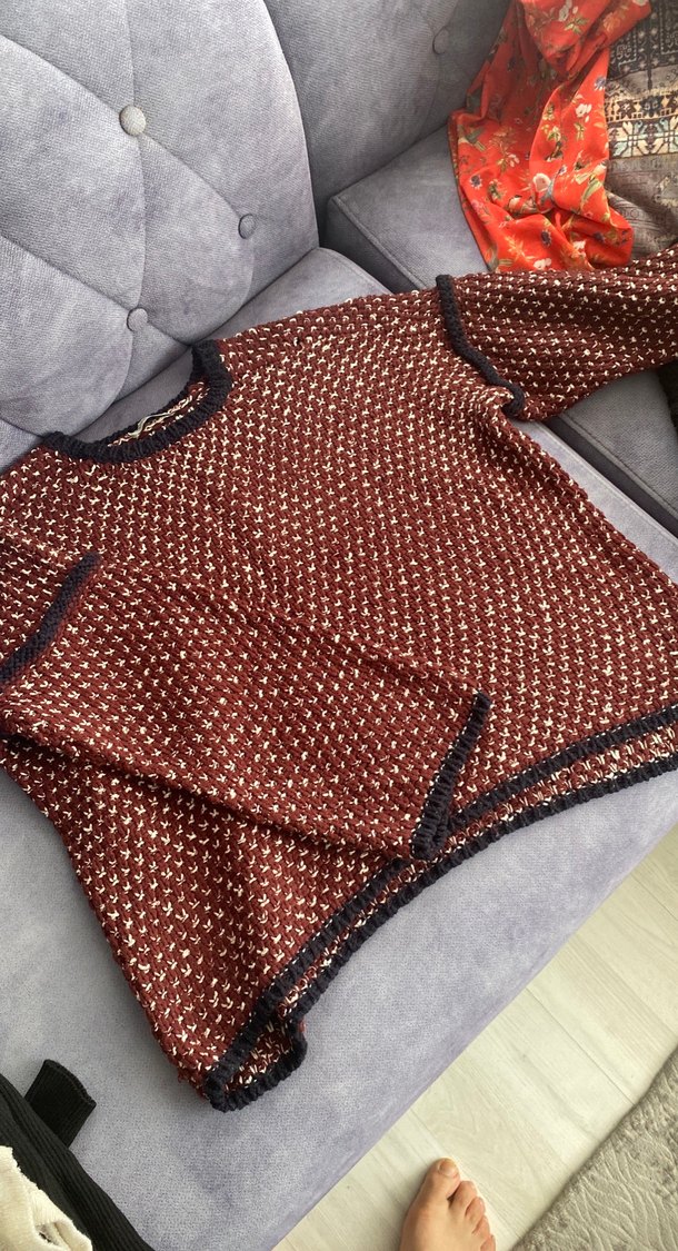Bordo renkli, örme kumaştan, bol kesim, uzun kollu ve yuvarlak yakalı bohem tarzda kadın triko kazak. Rahat ve günlük kullanıma uygun.