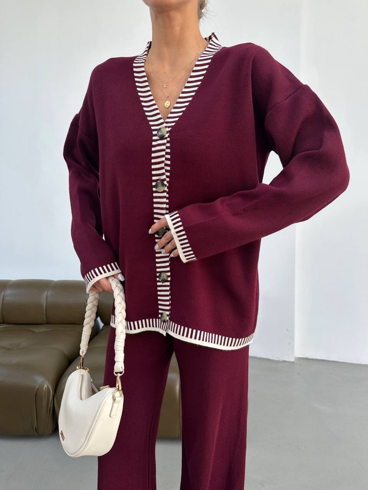 Bordo renkli, oversize fit, uzun boylu ve V yaka kadın takımı. Triko kumaştan, uzun kollu, zebra desenli çizgili detaylara sahip, günlük kullanıma uygun.
