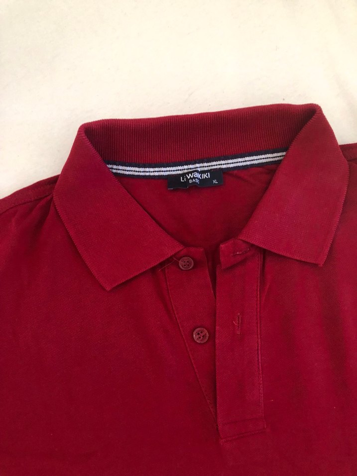 Bordo renkli, düğmeli yakalı erkek polo tişört. Kısa kollu, bol kesimli, yumuşak sentetik kumaştan, günlük kullanım için uygundur.