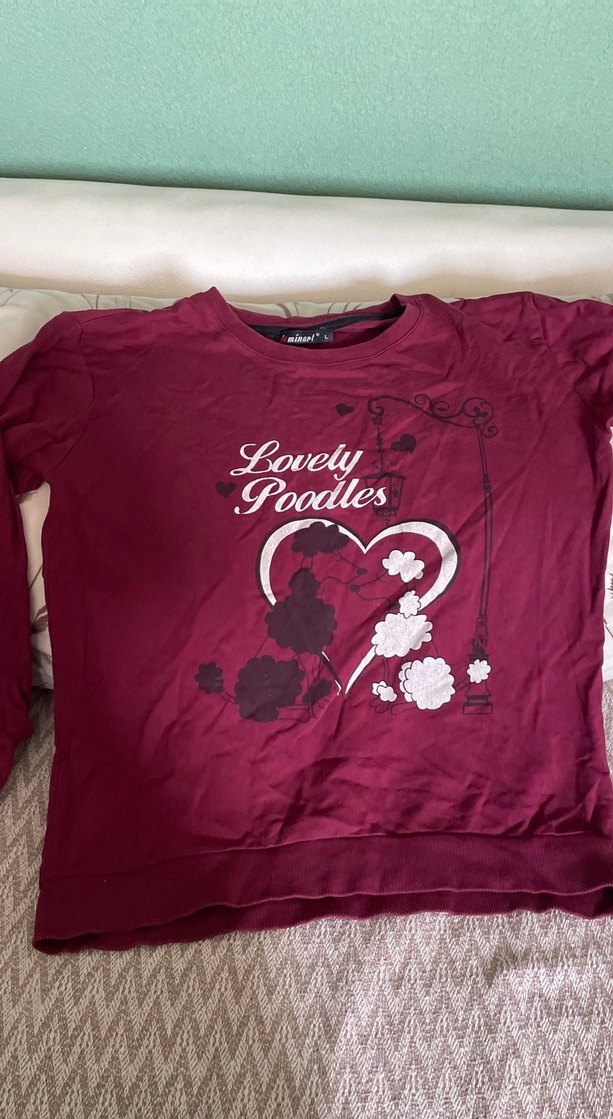 Bordo renkli pamuklu hamile tişörtü, uzun kollu ve yuvarlak yaka. Önde dantelli ve 'Lovely Poodles' baskılı, rahat ve salaş kesim. Günlük kullanıma uygun.