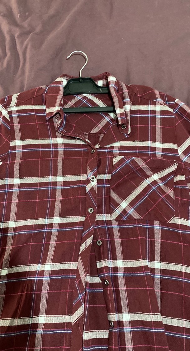 Bordo pamuklu gömlek, yakalı ve düğmeli, uzun kollu, rahat kesim