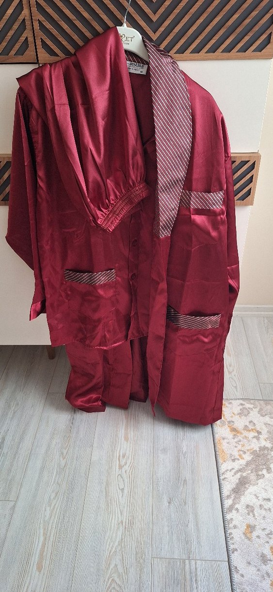 Bordo parıltılı uzun sabahlık, askılı kolları ve regular kesimiyle Paris tarzını yansıtıyor. Düğme ve ceplerle fonksiyonel detaylar içerir.✨