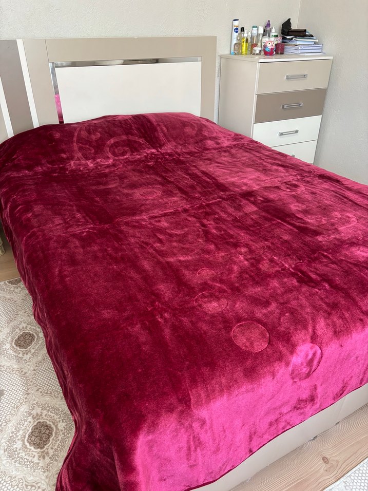 Parlak bordo renkte, batik desenli yumuşak ve pürüzsüz dokulu battaniye hiç kullanılmadı çeyiz için almıştım