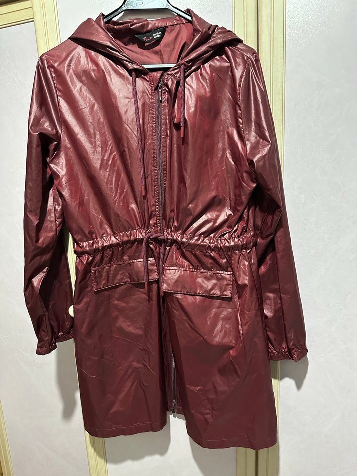 Bordo renk, parlak yüzeyli midi yağmurluk, bel detaylı ve ince kesim. Askılı kolları ve kesik yaka detayıyla sokak stiline uygun.penti marka large beden. Large beden almışım büyük geldi kullanamadım. Sadece birkez kullandım.