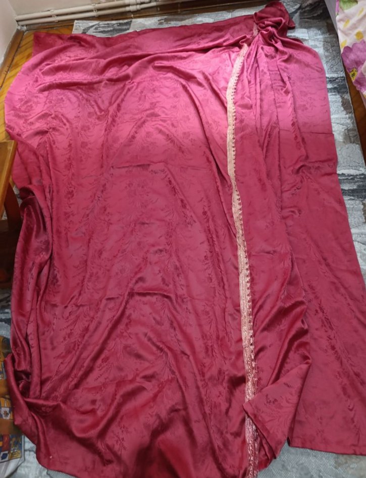 Bordo renkli, parlak kumaştan yapılmış, bohem tarzı ve desensiz perde. Her odaya sıcak ve şık bir hava katar.