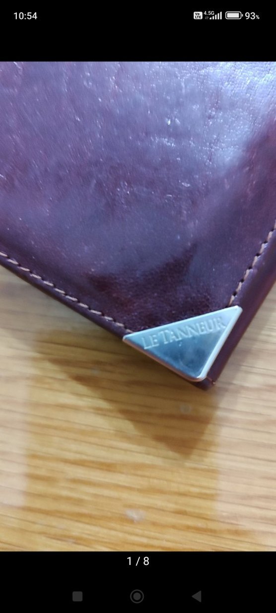 Bordo parlak deri erkek cüzdan, 'LE TANNEUR' yazılı metal köşe detayıyla vintage Paris tarzını yansıtıyor. Düz yüzeylidir.