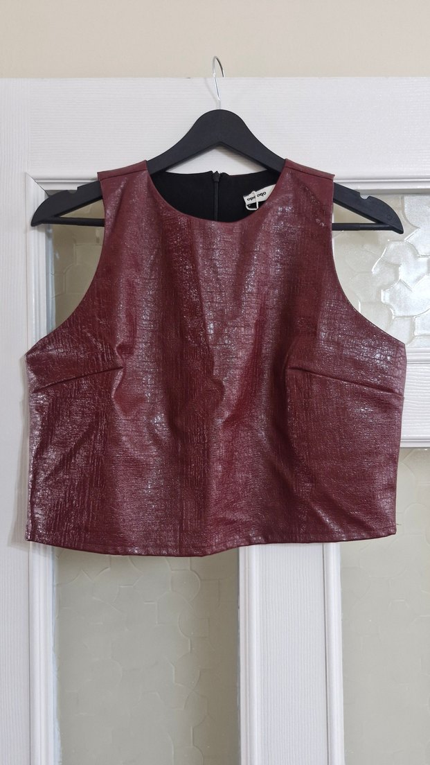 Şortlu Takım-Bordo Parlak Deri Görünümlü Kolsuz Bluz ve Şort