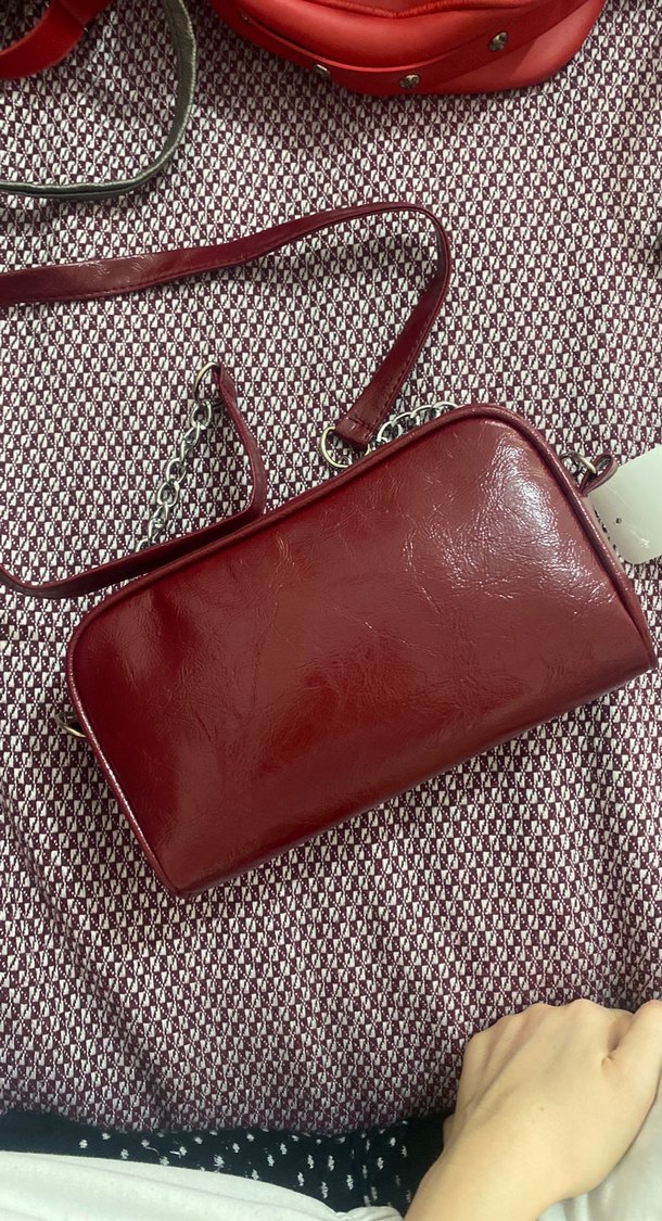 Bordo parlak deri, yılan derisi desenli, fermuarlı kadın çanta. Modern klasik tarzda, günlük kullanım için uygun.