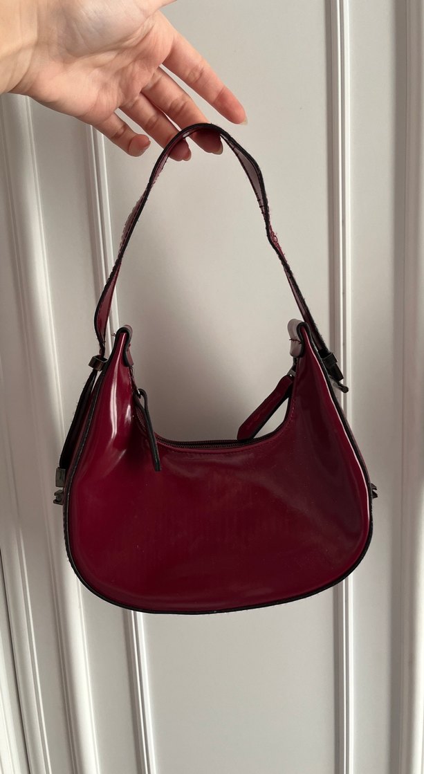 Bordo parlak deri çanta, tokalı detayları ve cesur gotik tarzıyla Paris esintisi sunar, günlük kullanıma uygundur.