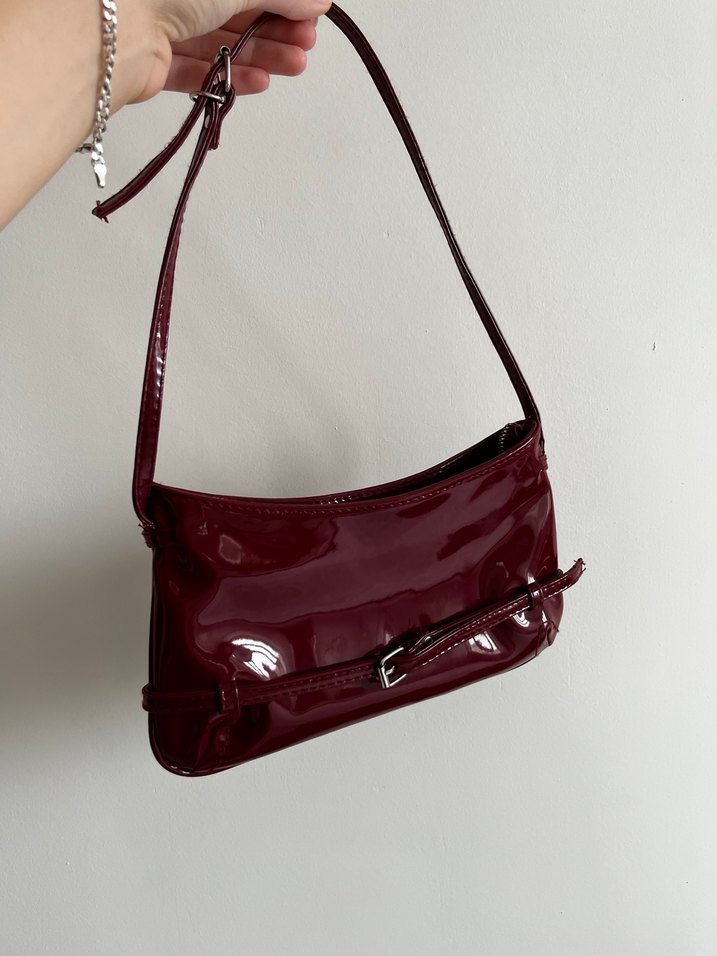 Bordo parlak deri kadın çanta, tokalı detayıyla dikkat çeker. Cesur sokak stili ve günlük kullanım için uygundur.