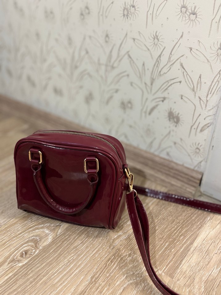 Parlak bordo deri kadın çanta, modern klasik tarzda, desensiz yüzeye sahip. Günlük kullanıma uygun, Çıkarılabilir askı ve altın tonlu detaylar bulunur. Hiç kullanmadım. Aldığım gibi durdu askıda sıfır.