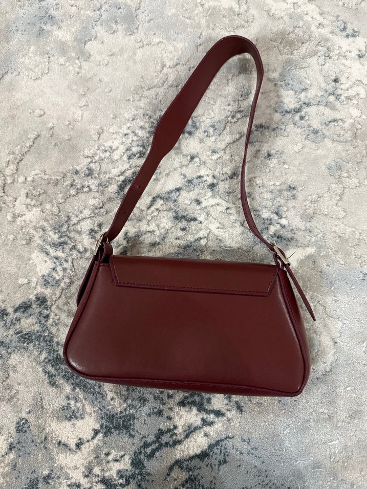 Bordo parlak deri ve kürk detaylı kadın çantası, modern klasik tarzda, minimal desenli, günlük kullanıma uygun tek askılı tasarım.