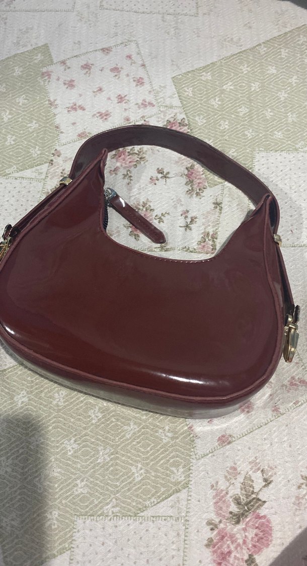 Bordo deri çanta, parlak yüzeyi ve tokalı detayıyla vintage esintisini modern klasik tarzla birleştiriyor.