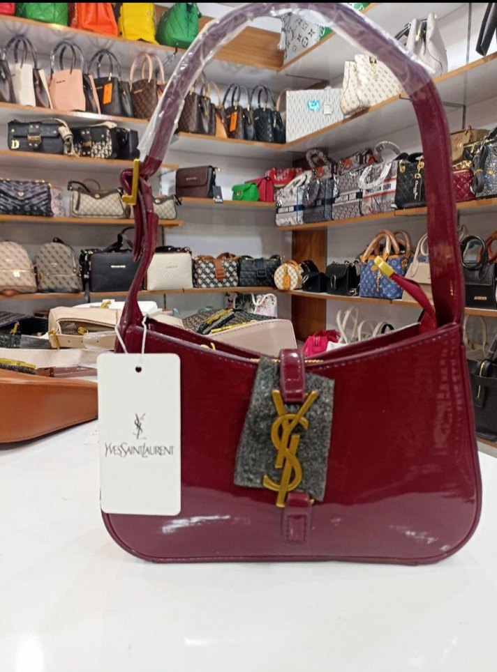 Bordo renkli, parlak deri omuz çantası, tokalı detay ve baskılı desen ile cesur sokak stili için uygun. Marka: Yves Saint Laurent.