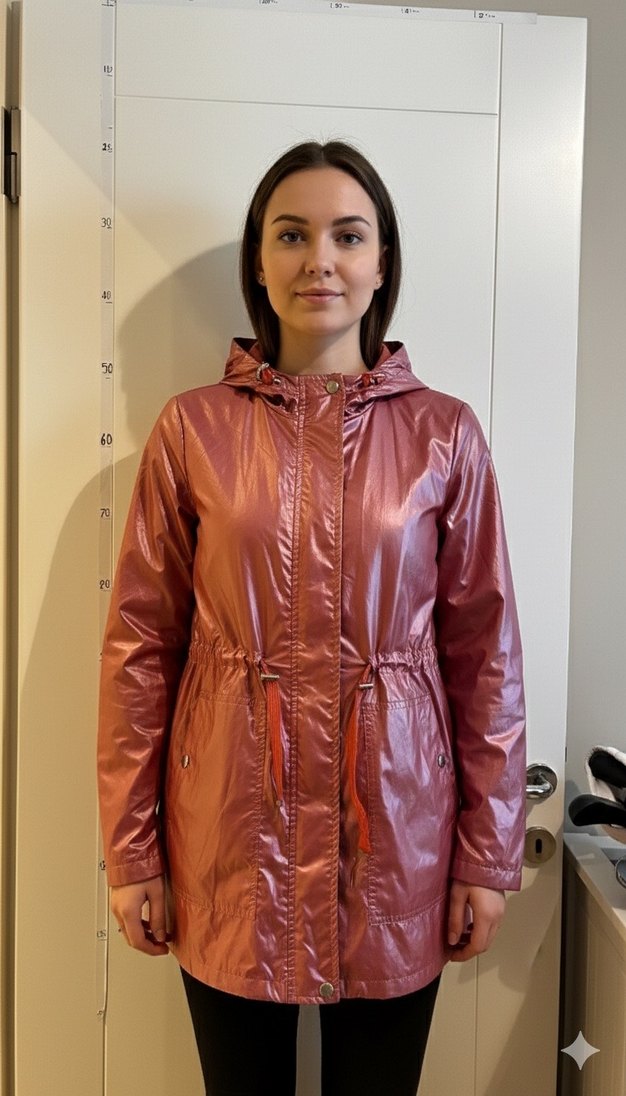 Pembe parlak deri görünümlü midi uzunlukta, bol kesim, çok hafif yağmurluk.