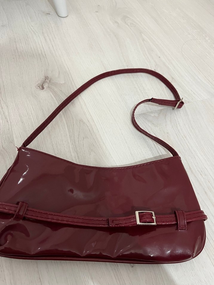 Bordo parlak deri kadın çanta, tokalı kayış ve desensiz şık tasarımıyla klasik sokak stiline uygundur.