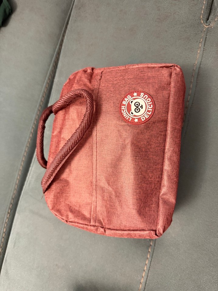 Bordo renkli, parlak kumaştan yapılmış, baskılı logo detayı ve sağlam sapı olan  beslenme çantası ürün hiç kullanılmadı tertemiz