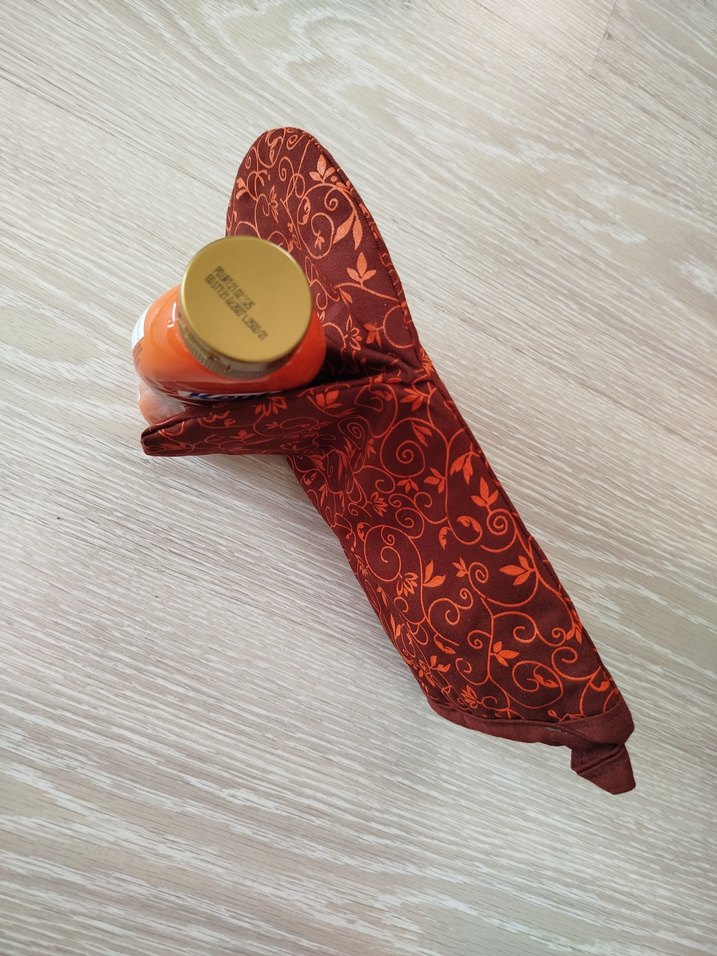 Bordo renkte, parlak ve desenli fırın eldiveni, sıcak eşyaları tutarken koruma sağlar.